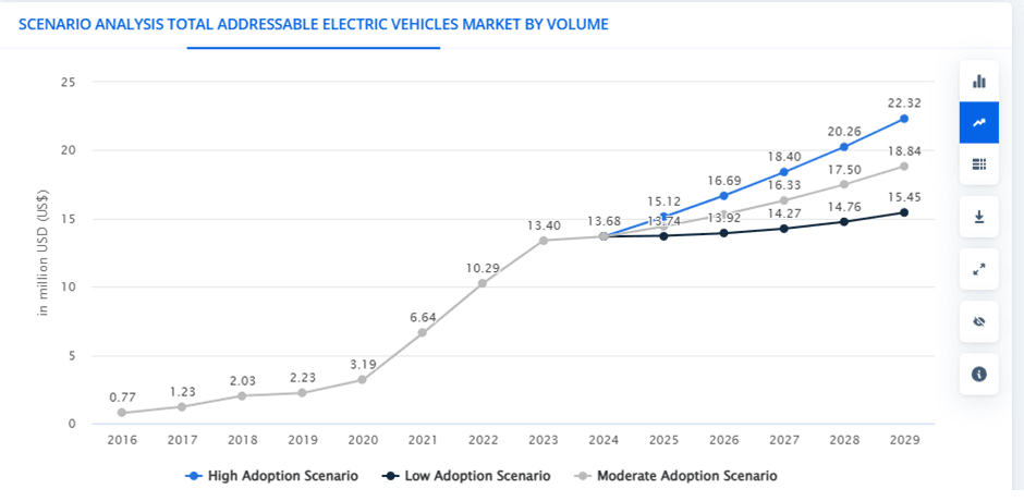 • The Electric Vehicles market on the global ground is estimated to grow by 6.63% (2024-2029) resulting in a market volume of US$1084.0bn in 2029.